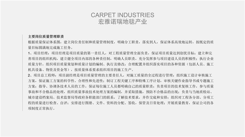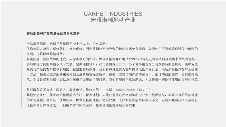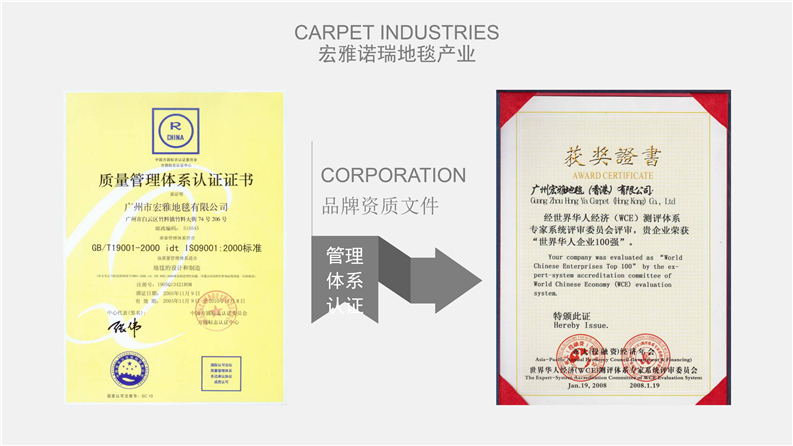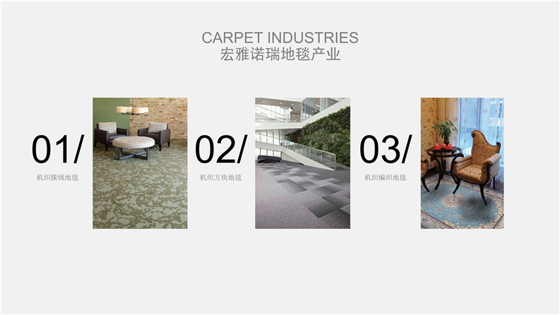 2012年,宏雅諾瑞地毯品牌為更好的適應市場日益快速發展的需求,戰略性合作各地化纖生產集團共同研發大型商用地毯產品,志在全面性做好品牌在全球的市場營銷戰略,聯合工廠占地面積60萬平方米以上、員工6000余人、中高級技術人員300余人,規劃以資源循環高效利用為主發展的高科技企業,擁有羊毛、特種環保纖維、尼龍長絲及特種V紗地毯原料生產的多套生產線,是國內唯一擁有綠色環保資源循環全套產業鏈的大型企業。